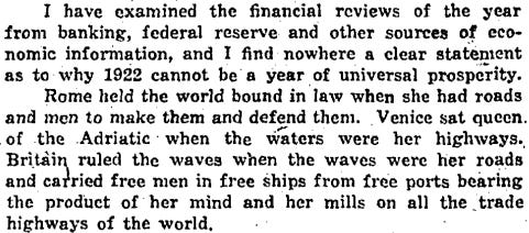 Clarence W. Barron provides his “Outlook for 1922,” and all 800 words of passion are palpable. My goodness. Before he prognosticates, he provides readers a history lesson. Americans find themselves at a unique moment in their country’s history. Barron believes the risk/return profile favors US equities in this brand new Washington-led world.